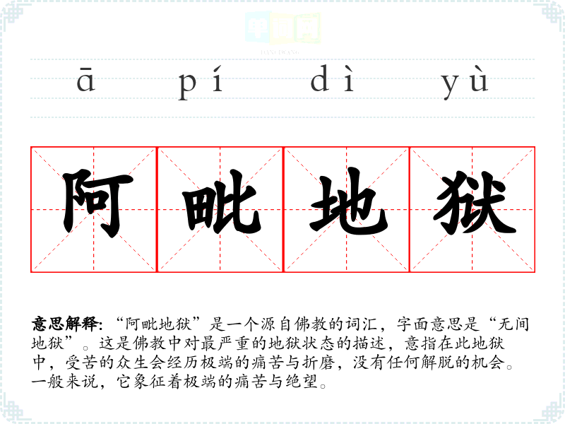 | 阿毗地狱 | 阿毗:梵语的译音,意译为“无间”,即痛苦无有间断之意。常用来比喻黑暗的社会和严酷的牢狱。又比喻无法摆脱的极其痛苦的境地。 |