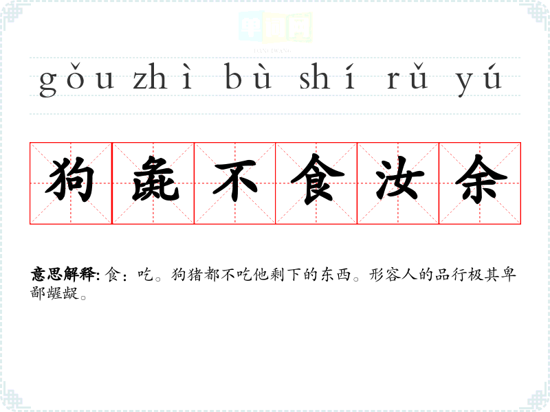 | 狗彘不食汝余 | 食:吃。狗猪都不吃他剩下的东西。形容人的品行极其卑鄙龌龊。 |