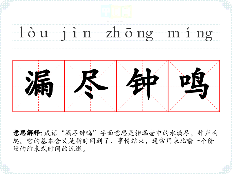 成语“漏尽钟鸣”字面意思是指漏壶中的水滴尽,钟声响起。它的基本含义是指时间到了,事情结束,通常用来比喻一个阶段的结束或时间的流逝。