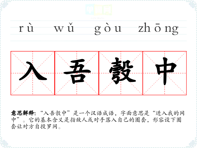 “入吾彀中”是一个汉语成语,字面意思是“进入我的网中”。它的基本含义是指敌人或对手落入自己的圈套,形容设下圈套让对方自投罗网。