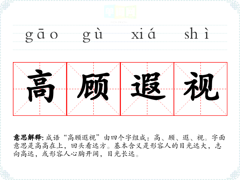 成语“高顾遐视”由四个字组成:高、顾、遐、视。字面意思是高高在上,回头看远方。基本含义是形容人的目光远大,志向高远,或形容人心胸开阔,目光长远。