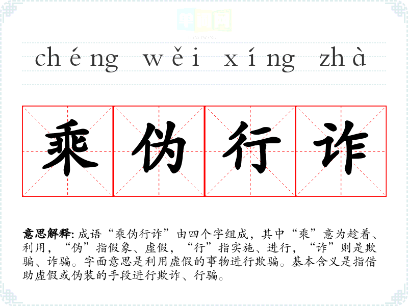 成语“乘伪行诈”由四个字组成,其中“乘”意为趁着、利用,“伪”指假象、虚假,“行”指实施、进行,“诈”则是欺骗、诈骗。字面意思是利用虚假的事物进行欺骗。基本含义是指借助虚假或伪装的手段进行欺诈、行骗。