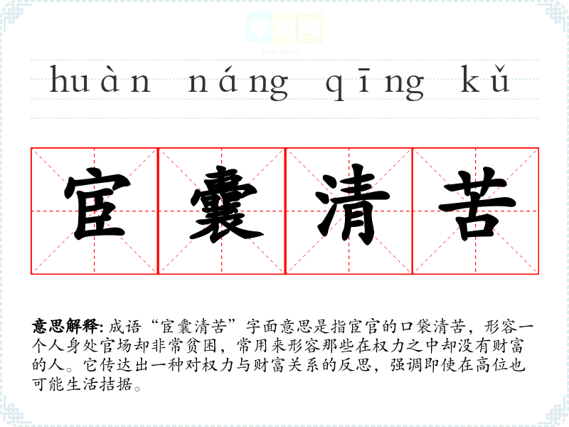 成语“宦囊清苦”字面意思是指宦官的口袋清苦,形容一个人身处官场却非常贫困,常用来形容那些在权力之中却没有财富的人。它传达出一种对权力与财富关系的反思,强调即使在高位也可能生活拮据。