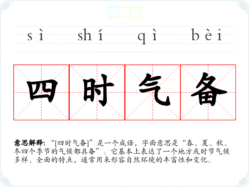 “[四时气备]”是一个成语,字面意思是“春、夏、秋、冬四个季节的气候都具备”。它基本上表达了一个地方或时节气候多样、全面的特点,通常用来形容自然环境的丰富性和变化。
