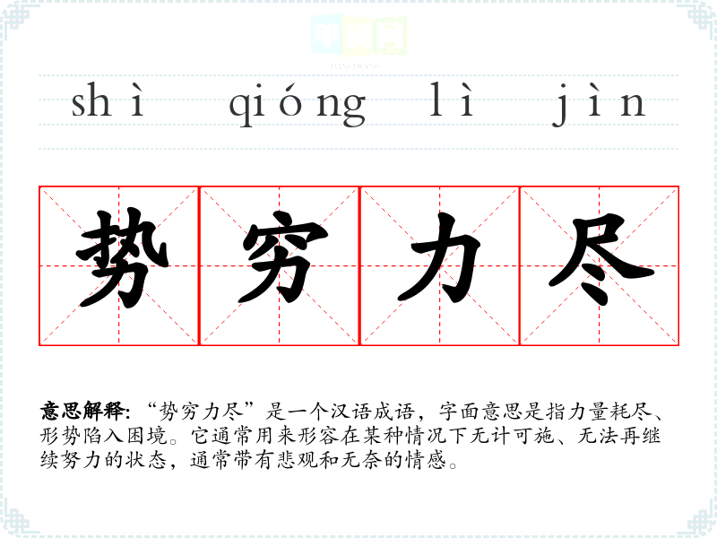 “势穷力尽”是一个汉语成语,字面意思是指力量耗尽、形势陷入困境。它通常用来形容在某种情况下无计可施、无法再继续努力的状态,通常带有悲观和无奈的情感。
