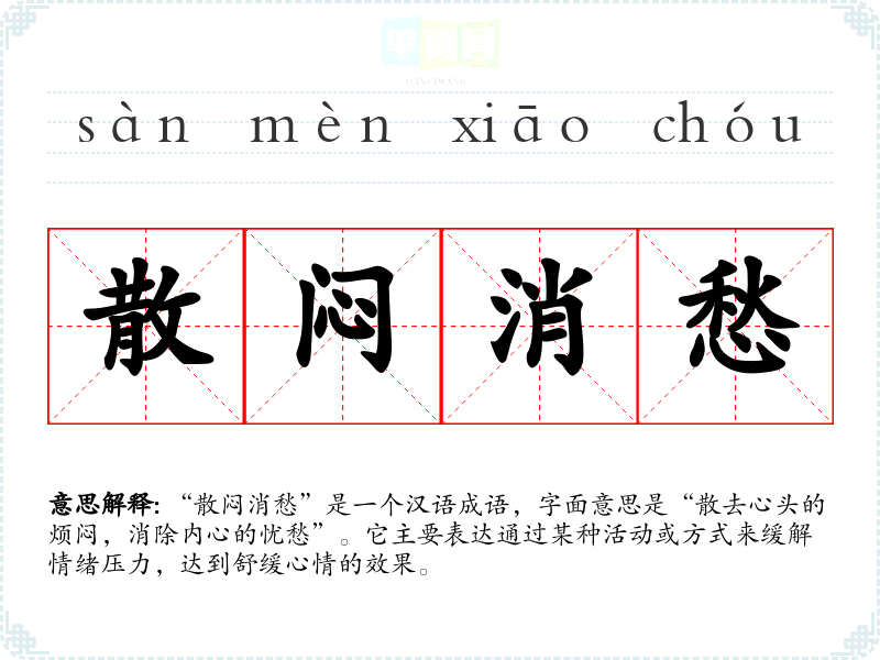 “散闷消愁”是一个汉语成语,字面意思是“散去心头的烦闷,消除内心的忧愁”。它主要表达通过某种活动或方式来缓解情绪压力,达到舒缓心情的效果。