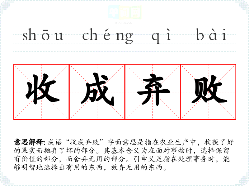 成语“收成弃败”字面意思是指在农业生产中,收获了好的果实而抛弃了坏的部分。其基本含义为在面对事物时,选择保留有价值的部分,而舍弃无用的部分。引申义是指在处理事务时,能够明智地选择出有用的东西,放弃无用的东西。