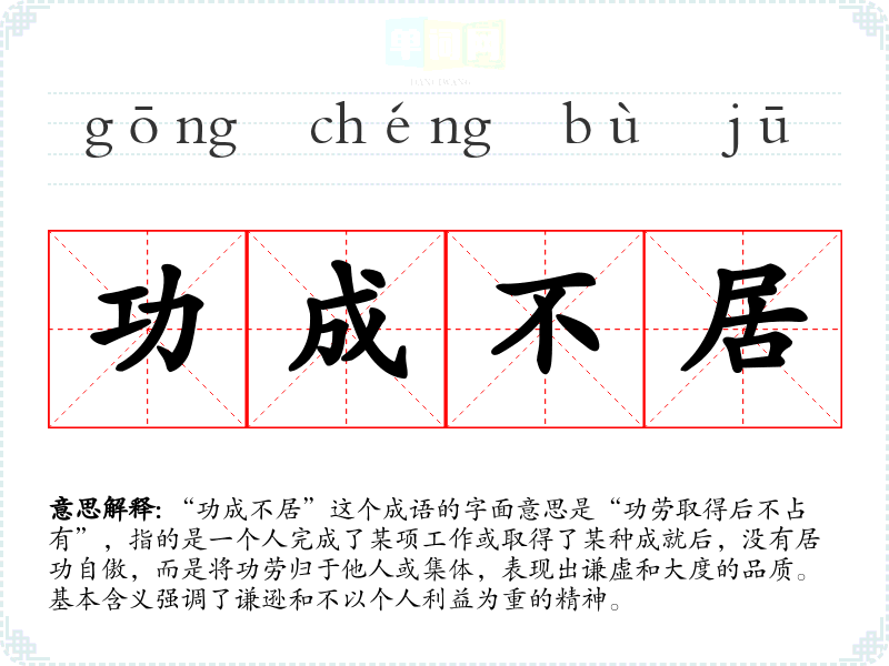 “功成不居”这个成语的字面意思是“功劳取得后不占有”,指的是一个人完成了某项工作或取得了某种成就后,没有居功自傲,而是将功劳归于他人或集体,表现出谦虚和大度的品质。基本含义强调了谦逊和不以个人利益为重的精神。