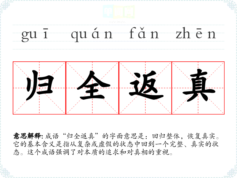 成语“归全返真”的字面意思是:回归整体,恢复真实。它的基本含义是指从复杂或虚假的状态中回到一个完整、真实的状态。这个成语强调了对本质的追求和对真相的重视。