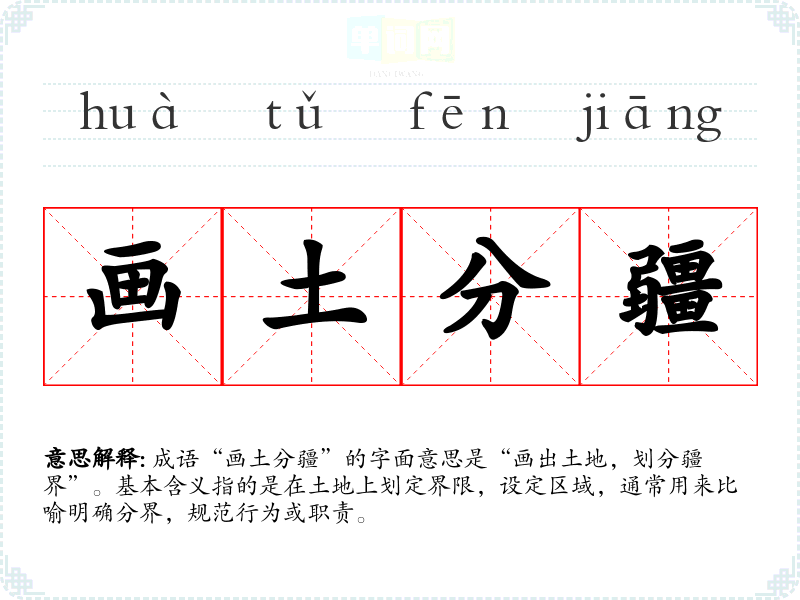 成语“画土分疆”的字面意思是“画出土地,划分疆界”。基本含义指的是在土地上划定界限,设定区域,通常用来比喻明确分界,规范行为或职责。