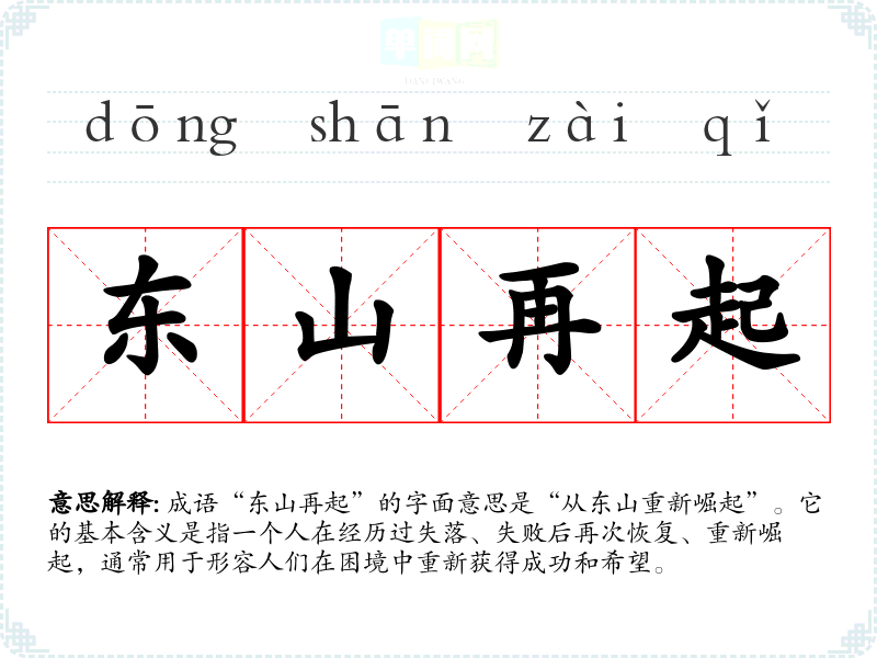 成语“东山再起”的字面意思是“从东山重新崛起”。它的基本含义是指一个人在经历过失落、失败后再次恢复、重新崛起,通常用于形容人们在困境中重新获得成功和希望。