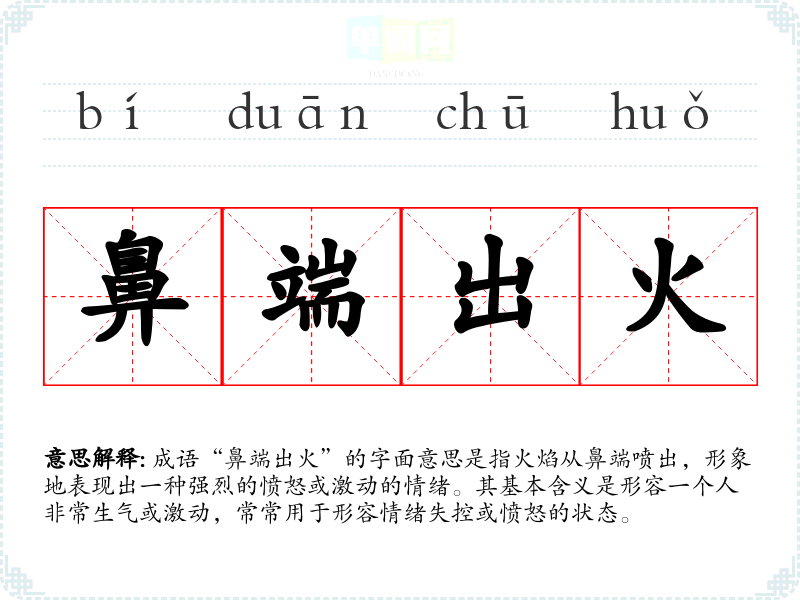 成语“鼻端出火”的字面意思是指火焰从鼻端喷出,形象地表现出一种强烈的愤怒或激动的情绪。其基本含义是形容一个人非常生气或激动,常常用于形容情绪失控或愤怒的状态。