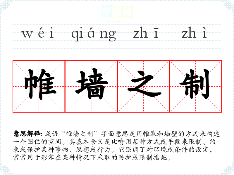 成语“帷墙之制”字面意思是用帷幕和墙壁的方式来构建一个围住的空间。其基本含义是比喻用某种方式或手段来限制、约束或保护某种事物、思想或行为。它强调了对环境或条件的设定,常常用于形容在某种情况下采取的防护或限制措施。
