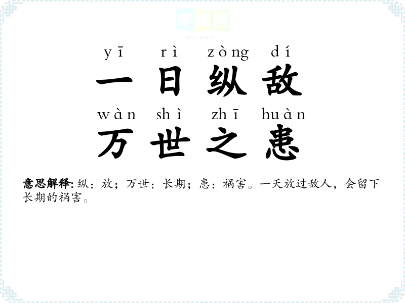 | 一日纵敌,万世之患 | 纵:放;万世:长期;患:祸害。一天放过敌人,会留下长期的祸害。 |