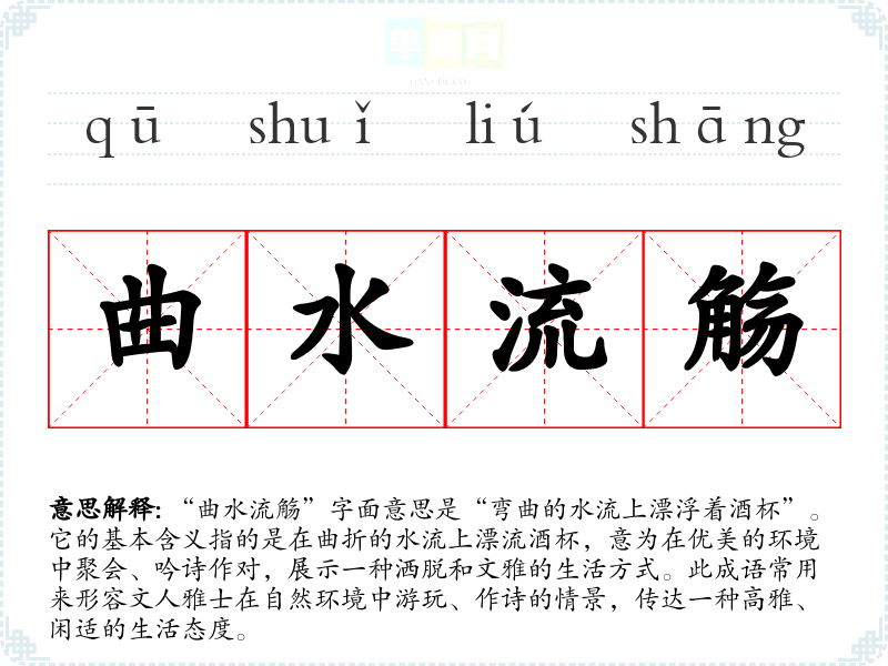 “曲水流觞”字面意思是“弯曲的水流上漂浮着酒杯”。它的基本含义指的是在曲折的水流上漂流酒杯,意为在优美的环境中聚会、吟诗作对,展示一种洒脱和文雅的生活方式。此成语常用来形容文人雅士在自然环境中游玩、作诗的情景,传达一种高雅、闲适的生活态度。