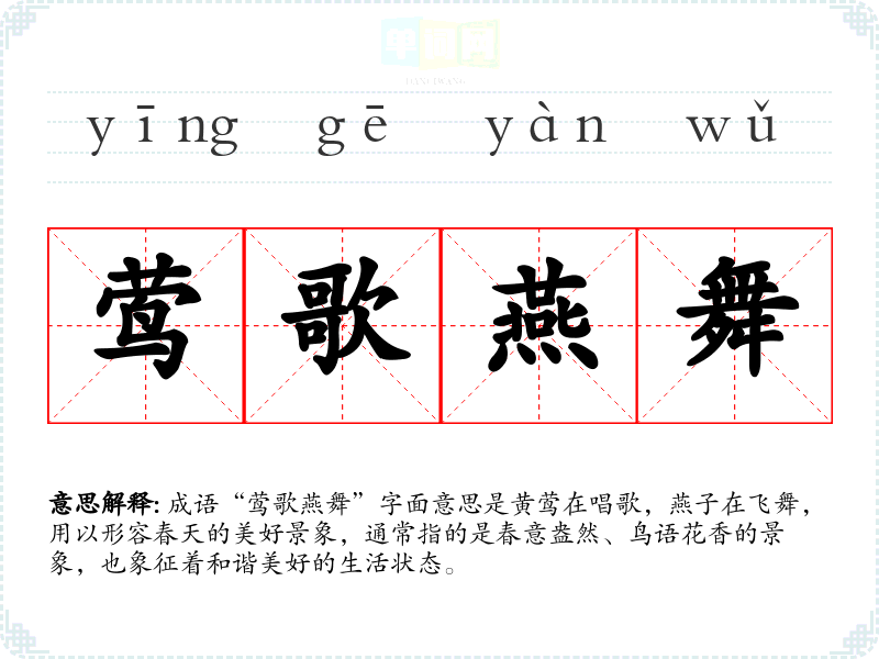 | 莺歌燕语 | 黄鹂歌唱,燕子呢喃。形容春天的美好景象。 |