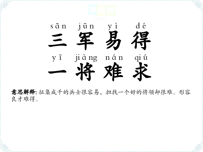 | 三军易得,一将难求 | 征集成千的兵士很容易,担找一个好的将领却很难。形容良才难得。 |