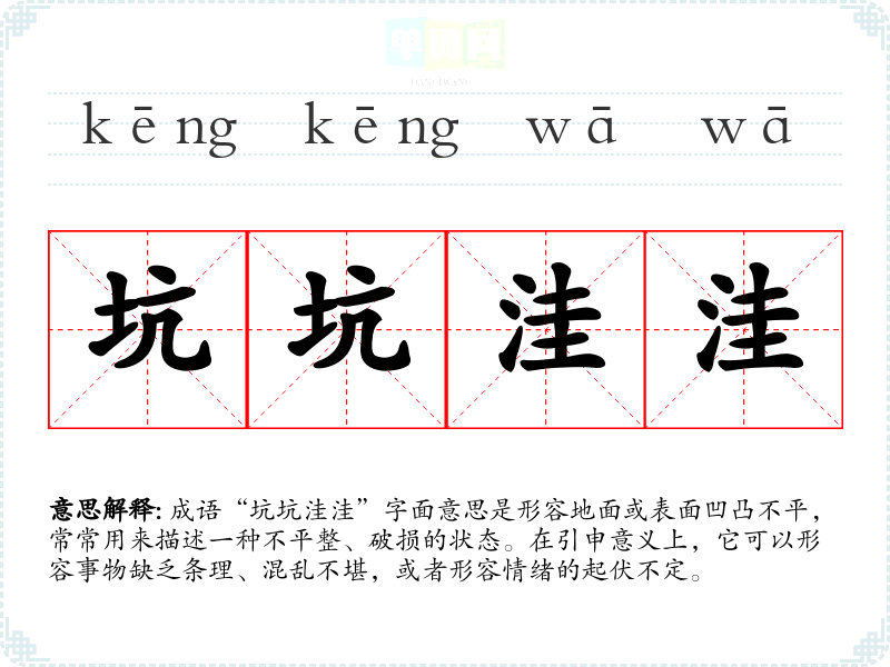 成语“坑坑洼洼”字面意思是形容地面或表面凹凸不平,常常用来描述一种不平整、破损的状态。在引申意义上,它可以形容事物缺乏条理、混乱不堪,或者形容情绪的起伏不定。