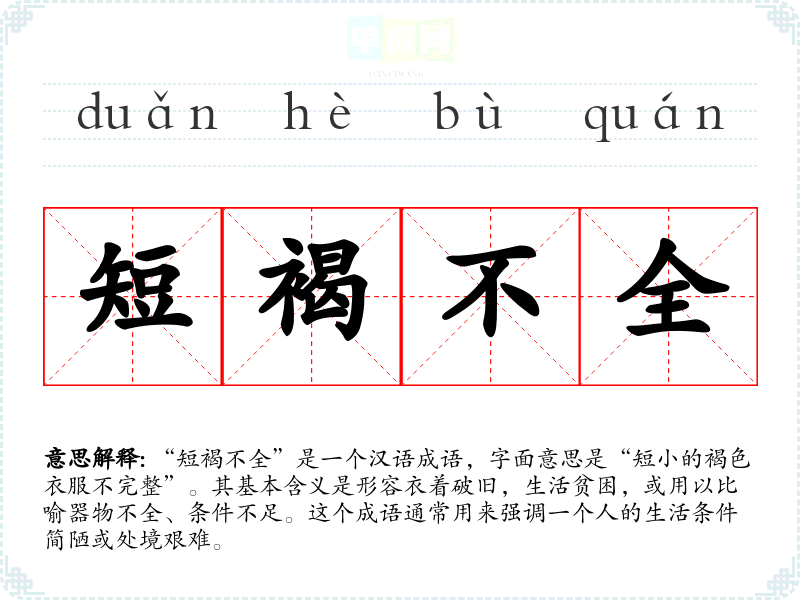 | 短褐不全 | 短褐:粗麻布短衣。粗布短衣还破旧不完整。形容生活贫苦。 |