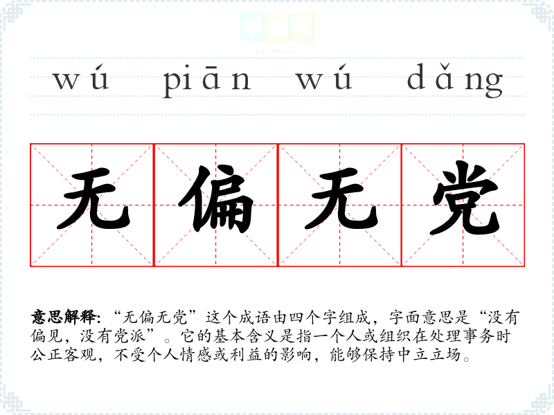 “无偏无党”这个成语由四个字组成,字面意思是“没有偏见,没有党派”。它的基本含义是指一个人或组织在处理事务时公正客观,不受个人情感或利益的影响,能够保持中立立场。