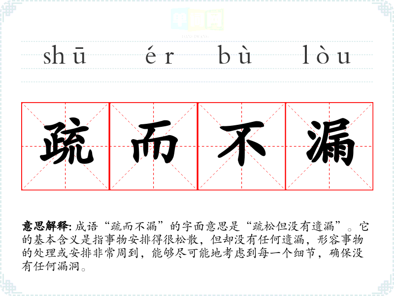 成语“疏而不漏”的字面意思是“疏松但没有遗漏”。它的基本含义是指事物安排得很松散,但却没有任何遗漏,形容事物的处理或安排非常周到,能够尽可能地考虑到每一个细节,确保没有任何漏洞。