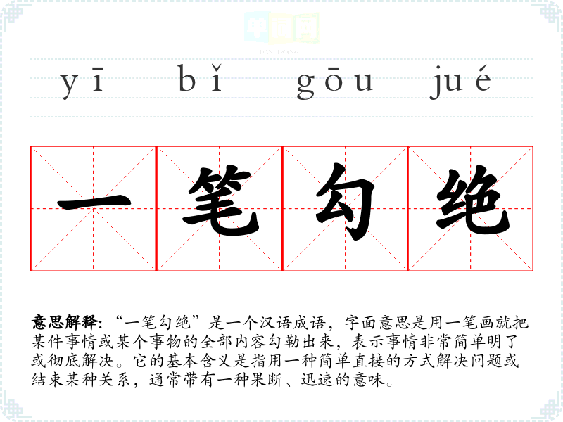 “一笔勾绝”是一个汉语成语,字面意思是用一笔画就把某件事情或某个事物的全部内容勾勒出来,表示事情非常简单明了或彻底解决。它的基本含义是指用一种简单直接的方式解决问题或结束某种关系,通常带有一种果断、迅速的意味。
