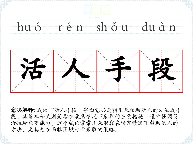 “活人手段”并没有明确的历史典故或文学出处,但可以理解为一种在古代流传下来的智慧。在传统文化中,救人于危难、施以援手的行为被视为一种美德。因此,这个成语的使用反映了人们对于救助他人的重视,以及在紧急情况下采取灵活手段的重要性。