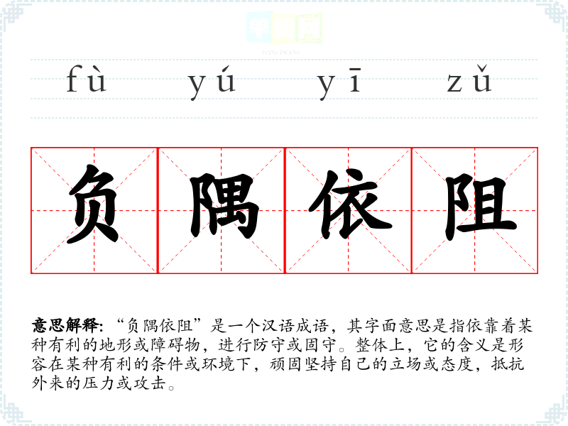 “负隅依阻”是一个汉语成语,其字面意思是指依靠着某种有利的地形或障碍物,进行防守或固守。整体上,它的含义是形容在某种有利的条件或环境下,顽固坚持自己的立场或态度,抵抗外来的压力或攻击。
