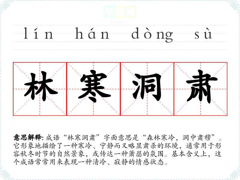 | 林寒洞肃 | 寒:寒冷;肃:肃杀。形容秋冬时林木萧疏,溪涧浅落的景象。 |
