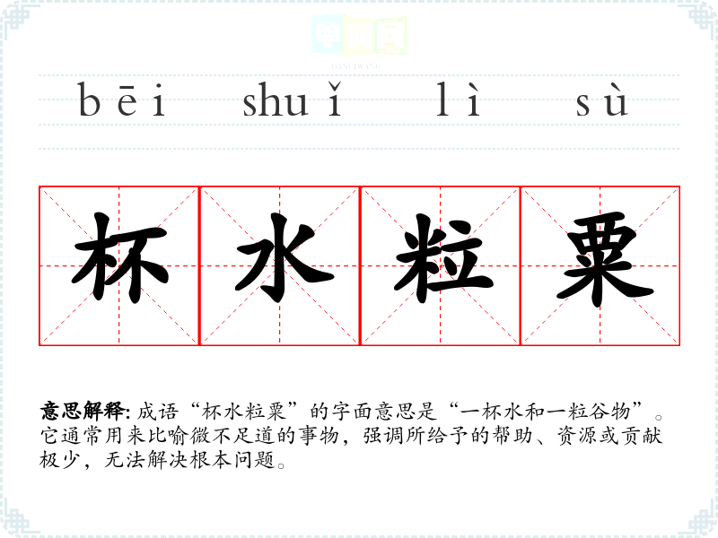 成语“杯水粒粟”的字面意思是“一杯水和一粒谷物”。它通常用来比喻微不足道的事物,强调所给予的帮助、资源或贡献极少,无法解决根本问题。