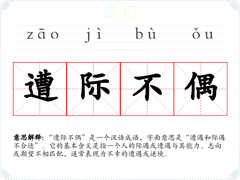 “遭际不偶”是一个汉语成语,字面意思是“遭遇和际遇不合适”。它的基本含义是指一个人的际遇或遭遇与其能力、志向或期望不相匹配,通常表现为不幸的遭遇或逆境。
