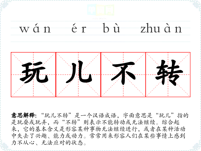 “玩儿不转”是一个汉语成语,字面意思是“玩儿”指的是玩耍或玩弄,而“不转”则表示不能转动或无法继续。综合起来,它的基本含义是形容某种事物无法继续进行,或者在某种活动中失去了兴趣、能力或动力。常常用来形容人们在某些事情上感到力不从心、无法应对的状态。