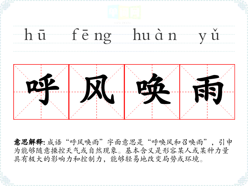 成语“呼风唤雨”字面意思是“呼唤风和召唤雨”,引申为能够随意操控天气或自然现象。基本含义是形容某人或某种力量具有极大的影响力和控制力,能够轻易地改变局势或环境。