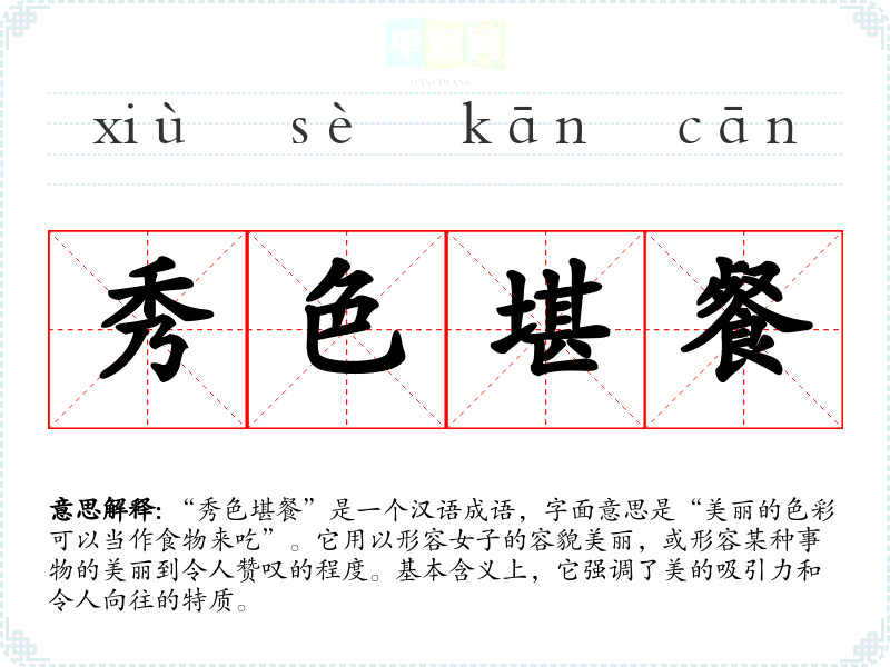 “秀色堪餐”是一个汉语成语,字面意思是“美丽的色彩可以当作食物来吃”。它用以形容女子的容貌美丽,或形容某种事物的美丽到令人赞叹的程度。基本含义上,它强调了美的吸引力和令人向往的特质。