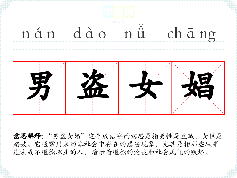 “男盗女娼”这个成语字面意思是指男性是盗贼,女性是娼妓。它通常用来形容社会中存在的恶劣现象,尤其是指那些从事违法或不道德职业的人,暗示着道德的沦丧和社会风气的败坏。