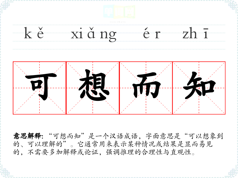 “可想而知”是一个汉语成语,字面意思是“可以想象到的、可以理解的”。它通常用来表示某种情况或结果是显而易见的,不需要多加解释或论证,强调推理的合理性与直观性。