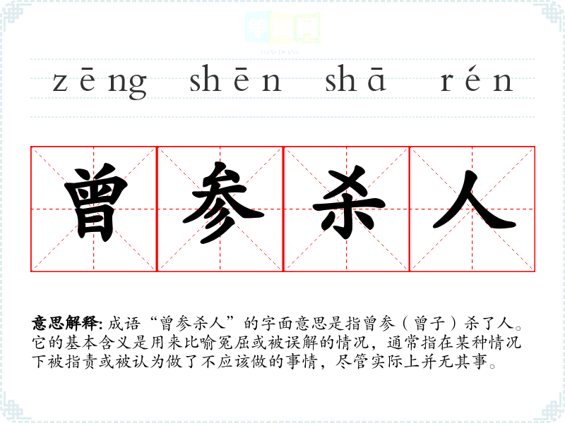 成语“曾参杀人”的字面意思是指曾参(曾子)杀了人。它的基本含义是用来比喻冤屈或被误解的情况,通常指在某种情况下被指责或被认为做了不应该做的事情,尽管实际上并无其事。