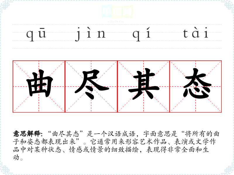 “曲尽其态”是一个汉语成语,字面意思是“将所有的曲子和姿态都表现出来”。它通常用来形容艺术作品、表演或文学作品中对某种状态、情感或情景的细致描绘,表现得非常全面和生动。