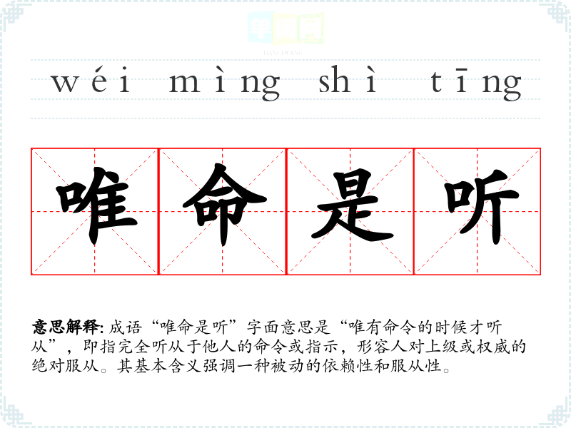 成语“唯命是听”字面意思是“唯有命令的时候才听从”,即指完全听从于他人的命令或指示,形容人对上级或权威的绝对服从。其基本含义强调一种被动的依赖性和服从性。