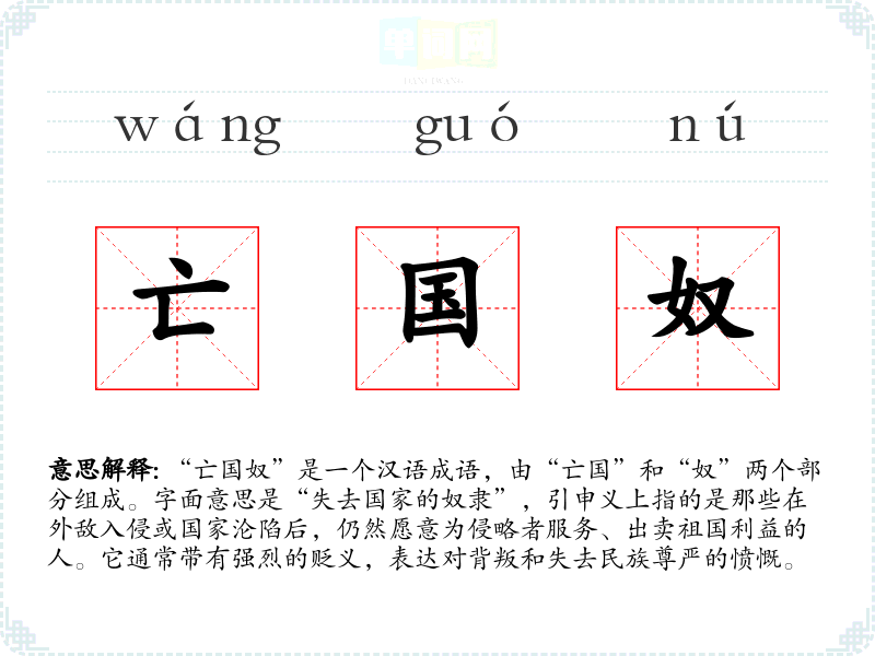 “亡国奴”是一个汉语成语,由“亡国”和“奴”两个部分组成。字面意思是“失去国家的奴隶”,引申义上指的是那些在外敌入侵或国家沦陷后,仍然愿意为侵略者服务、出卖祖国利益的人。它通常带有强烈的贬义,表达对背叛和失去民族尊严的愤慨。