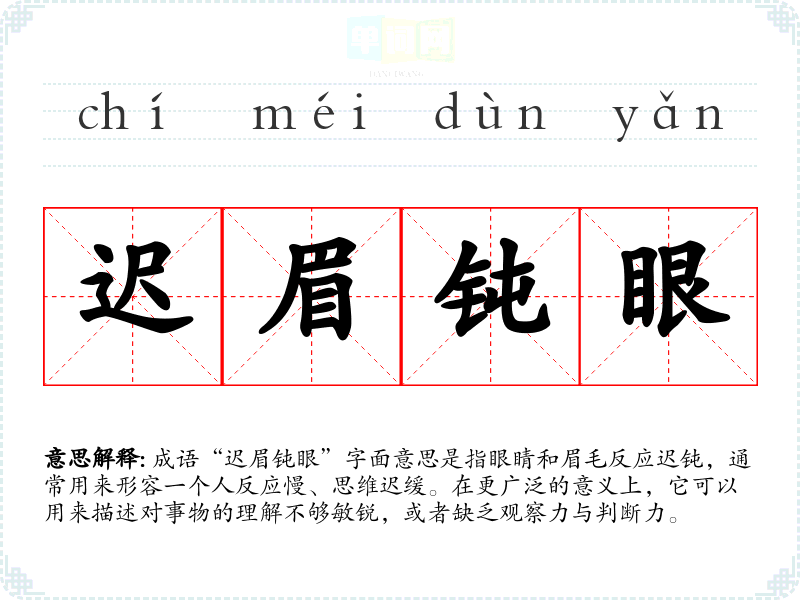 成语“迟眉钝眼”字面意思是指眼睛和眉毛反应迟钝,通常用来形容一个人反应慢、思维迟缓。在更广泛的意义上,它可以用来描述对事物的理解不够敏锐,或者缺乏观察力与判断力。