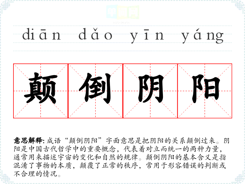 | 颠倒阴阳 | 犹言颠倒是非,混淆黑白。 |