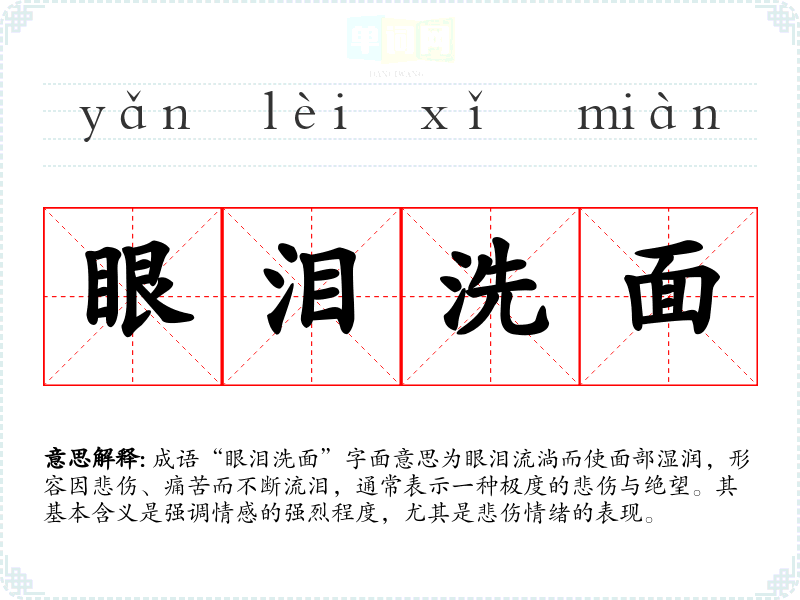 成语“眼泪洗面”字面意思为眼泪流淌而使面部湿润,形容因悲伤、痛苦而不断流泪,通常表示一种极度的悲伤与绝望。其基本含义是强调情感的强烈程度,尤其是悲伤情绪的表现。
