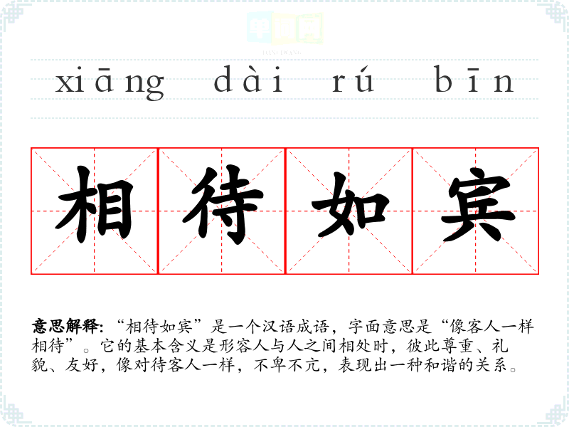 “相待如宾”是一个汉语成语,字面意思是“像客人一样相待”。它的基本含义是形容人与人之间相处时,彼此尊重、礼貌、友好,像对待客人一样,不卑不亢,表现出一种和谐的关系。