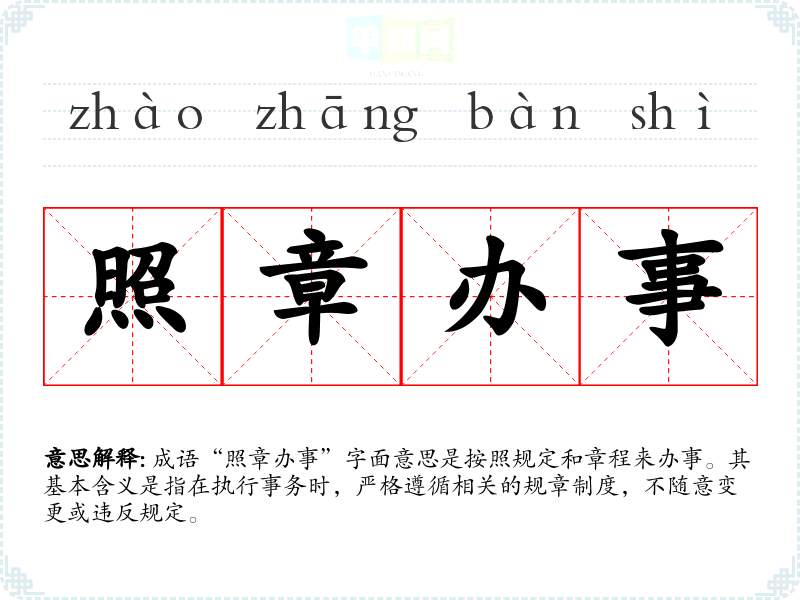 成语“照章办事”字面意思是按照规定和章程来办事。其基本含义是指在执行事务时,严格遵循相关的规章制度,不随意变更或违反规定。