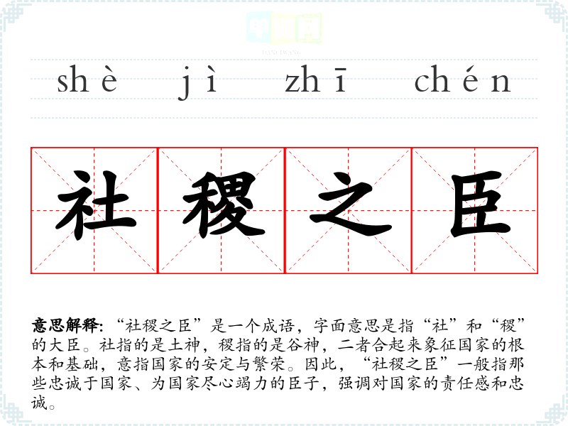 | 社稷之臣 | 称春秋时附庸于大国的小国。也称身负国家重任的大臣。 |