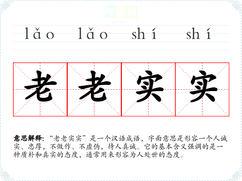 “老老实实”是一个汉语成语,字面意思是形容一个人诚实、忠厚,不做作、不虚伪,待人真诚。它的基本含义强调的是一种质朴和真实的态度,通常用来形容为人处世的态度。