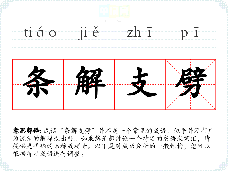 成语“条解支劈”并不是一个常见的成语,似乎并没有广为流传的解释或出处。如果您是想讨论一个特定的成语或词汇,请提供更明确的名称或拼音。以下是对成语分析的一般结构,您可以根据特定成语进行调整: