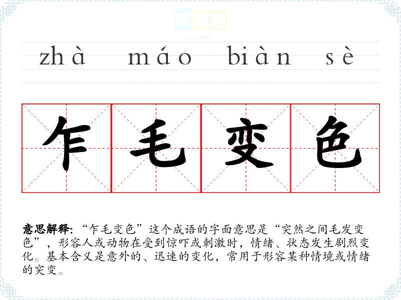 “乍毛变色”这个成语的字面意思是“突然之间毛发变色”,形容人或动物在受到惊吓或刺激时,情绪、状态发生剧烈变化。基本含义是意外的、迅速的变化,常用于形容某种情境或情绪的突变。