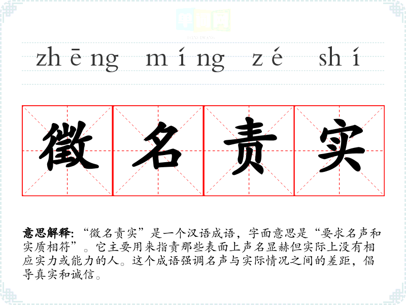 “徵名责实”是一个汉语成语,字面意思是“要求名声和实质相符”。它主要用来指责那些表面上声名显赫但实际上没有相应实力或能力的人。这个成语强调名声与实际情况之间的差距,倡导真实和诚信。